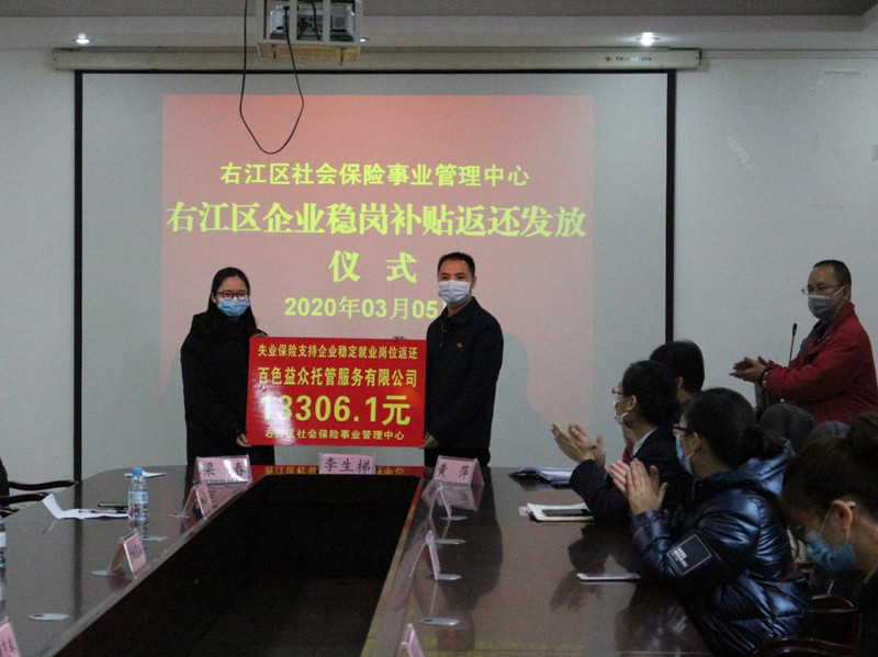 ??? 3月5日,在右江區(qū)社會(huì)保險(xiǎn)事業(yè)管理中心召開穩(wěn)崗補(bǔ)貼返還工作會(huì)議暨企業(yè)穩(wěn)崗補(bǔ)貼返還發(fā)放儀式,我公司作為首批返還企業(yè)代表之一應(yīng)邀參加,會(huì)上社保中心主任李生梯對(duì)我公司響應(yīng)穩(wěn)崗補(bǔ)貼政策給予高度肯定,期望通過穩(wěn)崗補(bǔ)貼返還為公司的穩(wěn)定復(fù)產(chǎn)助力。截止目前,我公司有8家子公司符合享受失業(yè)保險(xiǎn)穩(wěn)崗返還補(bǔ)貼條件,獲得穩(wěn)崗返還補(bǔ)貼3.6萬(wàn)元,惠及企業(yè)員工約150人。(通訊員:黃 芬)