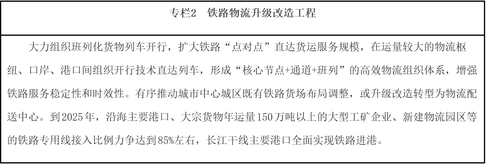 推進(jìn)結(jié)構(gòu)性降成本。加快推進(jìn)鐵路專用線進(jìn)港區(qū)、連園區(qū)、接廠區(qū),合理有序推進(jìn)大宗商品等中長距離運(yùn)輸“公轉(zhuǎn)鐵”、“公轉(zhuǎn)水”。完善集裝箱公鐵聯(lián)運(yùn)銜接設(shè)施,鼓勵發(fā)展集拼集運(yùn)、模塊化運(yùn)輸、“散改集”等組織模式,發(fā)揮鐵路干線運(yùn)輸成本低和公路網(wǎng)絡(luò)靈活優(yōu)勢,培育有競爭力的“門到門”公鐵聯(lián)運(yùn)服務(wù)模式,降低公鐵聯(lián)運(yùn)全程物流成本。統(tǒng)籌沿海港口綜合利用,提升大型港口基礎(chǔ)設(shè)施服務(wù)能力,提高碼頭現(xiàn)代化專業(yè)化規(guī)模化水平,加快推進(jìn)鐵水聯(lián)運(yùn)銜接場站改造,提高港口鐵路專用線集疏網(wǎng)絡(luò)效能,優(yōu)化作業(yè)流程。完善內(nèi)河水運(yùn)網(wǎng)絡(luò),統(tǒng)籌江海直達(dá)、江海聯(lián)運(yùn)發(fā)展,發(fā)揮近海航線、長江水道、珠江水道等水運(yùn)效能,穩(wěn)步推進(jìn)貨物運(yùn)輸“公轉(zhuǎn)水”。推進(jìn)鐵水聯(lián)運(yùn)業(yè)務(wù)單證電子化,促進(jìn)鐵路、港口信息互聯(lián),實(shí)現(xiàn)鐵路現(xiàn)車、裝卸車、貨物在途、到達(dá)預(yù)確報以及港口裝卸、貨物堆存、船舶進(jìn)出港、船期艙位預(yù)定等鐵水聯(lián)運(yùn)信息交換共享。支持港口、鐵路場站加快完善集疏運(yùn)油氣管網(wǎng),有效對接石化等產(chǎn)業(yè)布局,提高管道運(yùn)輸比例。