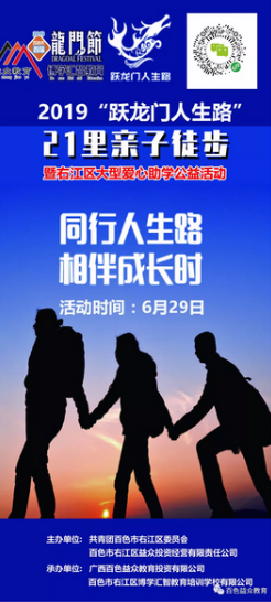 2019年百色市首屆龍門節(jié)暨右江區(qū)大型愛心助學(xué)公益活動第三場—“躍龍門人生路”親子徒步活動將于6月29日舉行,徒步全程10.5公里?;顒幽康氖菫榱烁玫貍鞑ァ凹彝?傳承+親子”的價值理念,以徒步的形式延伸出孩子成長路上的每個階段,徒步的背后蘊(yùn)含著一個永不言棄的家庭奮斗精神?;顒訄?bào)名費(fèi)用50元/家庭(含2家長+1孩子或者1家長+2孩子),所有報(bào)名費(fèi)用由共青團(tuán)百色市右江區(qū)委員會捐贈給右江區(qū)建檔立卡的貧困家庭學(xué)生。報(bào)名參與長按海報(bào)上二維碼識別繳費(fèi)即可,歡迎廣大學(xué)生家長踴躍參與。