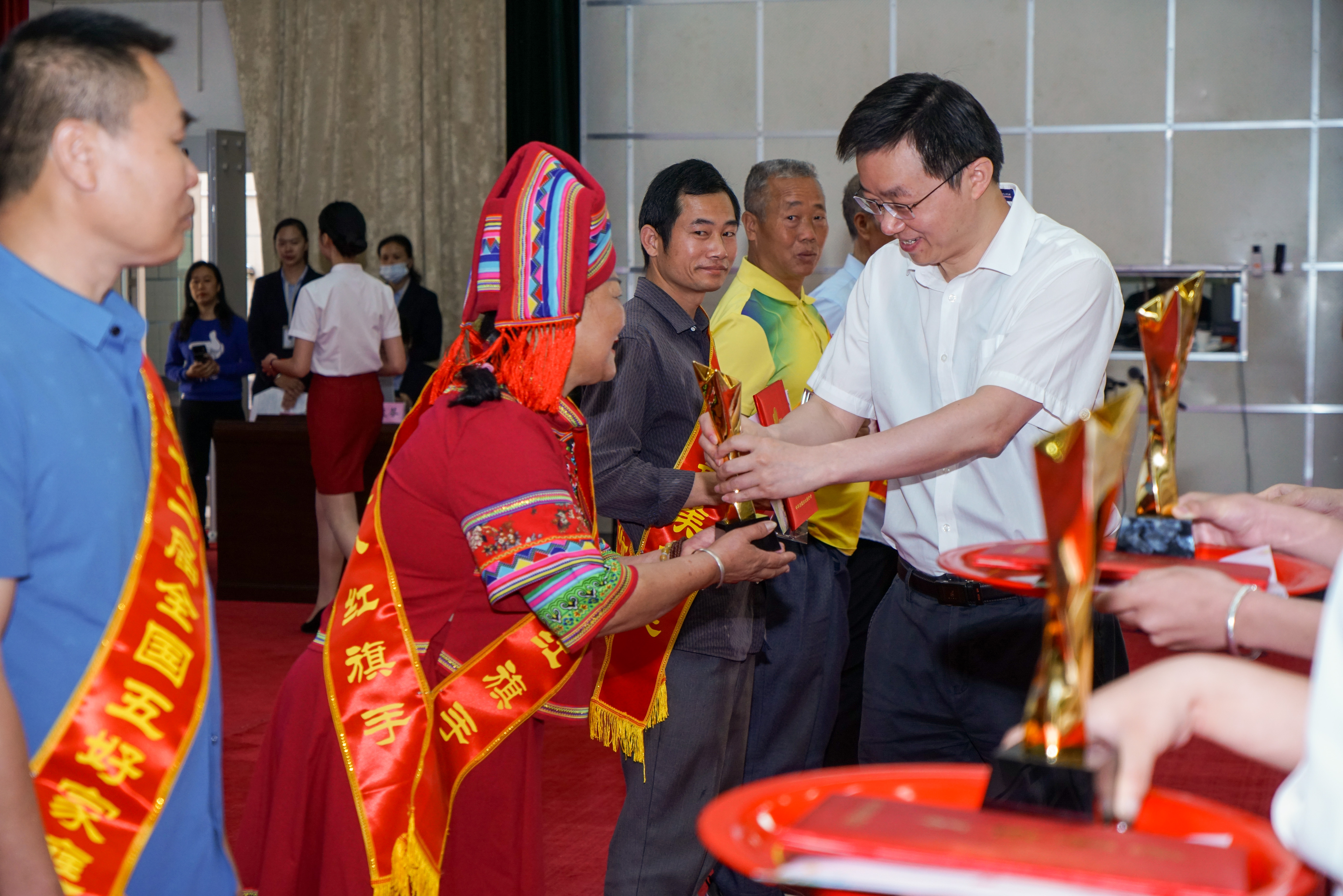 ????????活動中,市委常委、市人民政府副市長周付生及市婦聯(lián)、市文明辦、市總工會、市教育局領(lǐng)導(dǎo)依次上臺,向全國、自治區(qū)、市級“三八紅旗手標(biāo)兵”“三八紅旗手”“巾幗建功標(biāo)兵”“巾幗建功先進(jìn)個人”“維護(hù)婦女兒童權(quán)益先進(jìn)個人”等典型代表進(jìn)行慰問,為2020年“五好家庭”“最美家庭”和抗疫“最美家庭”發(fā)放證書、獎杯及禮遇大禮包,并向禮遇愛心單位頒發(fā)牌匾。