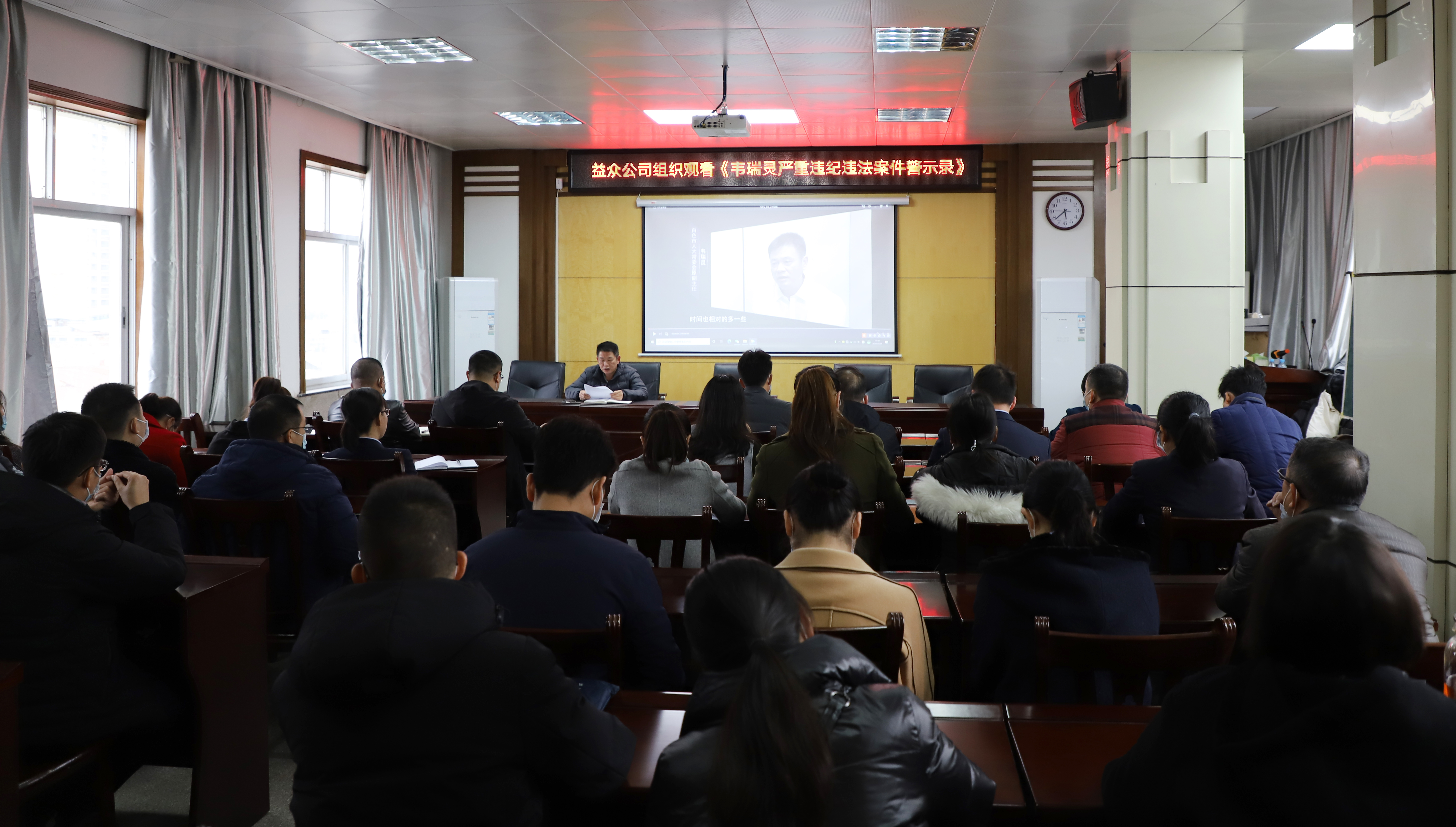 ????????根據(jù)右江區(qū)委要求,結(jié)合“不忘初心、牢記使命”主題教育。1月29日,益眾公司領(lǐng)導(dǎo)班子成員、全體黨員干部及各部門(子公司)中層干部集中觀看了《理想信念滑坡是最危險的滑坡——廣西百色市人大常委會原副主任韋瑞靈嚴(yán)重違紀(jì)違法案件警示錄》專題片。