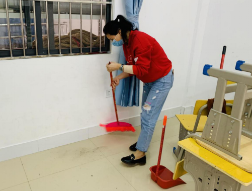 教職工認(rèn)真打掃教室的每一個(gè)角落