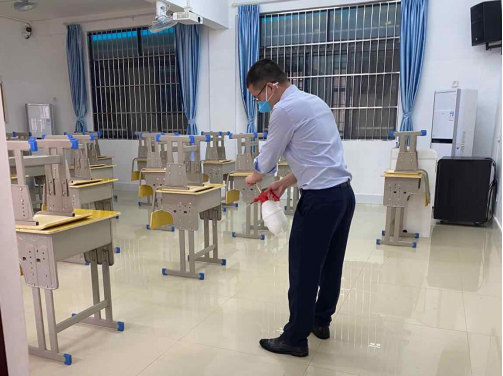 教職工對(duì)教室里里外外全面消毒殺菌