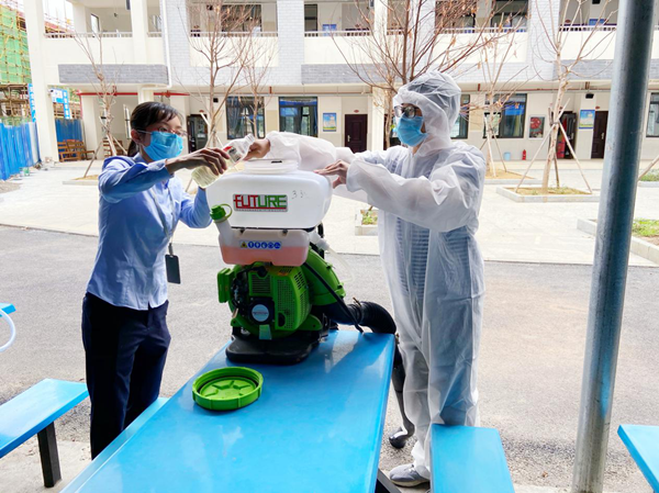 校區(qū)人員協(xié)助醫(yī)務(wù)人員添加消毒水