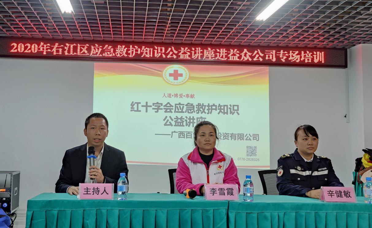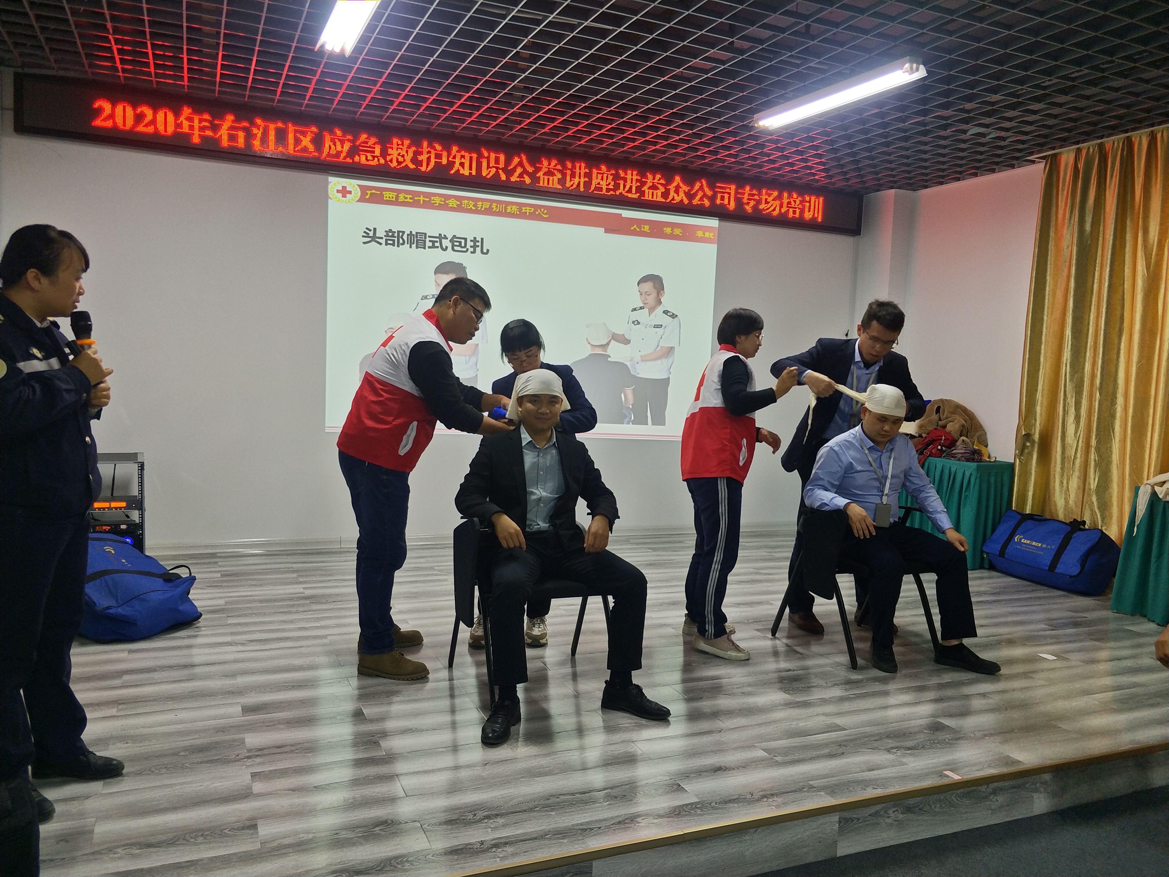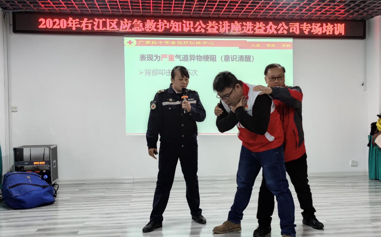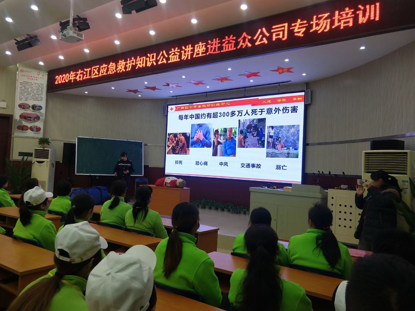 ????????為普及應急救護知識,提高員工安全防范意識、自救互救能力和應急救護技能,12月2日、6日,益眾公司邀請百色市右江區(qū)紅十字會到公司開展急救知識技能培訓,公司百余名管理人員、有關直屬班組400余人參加培訓。