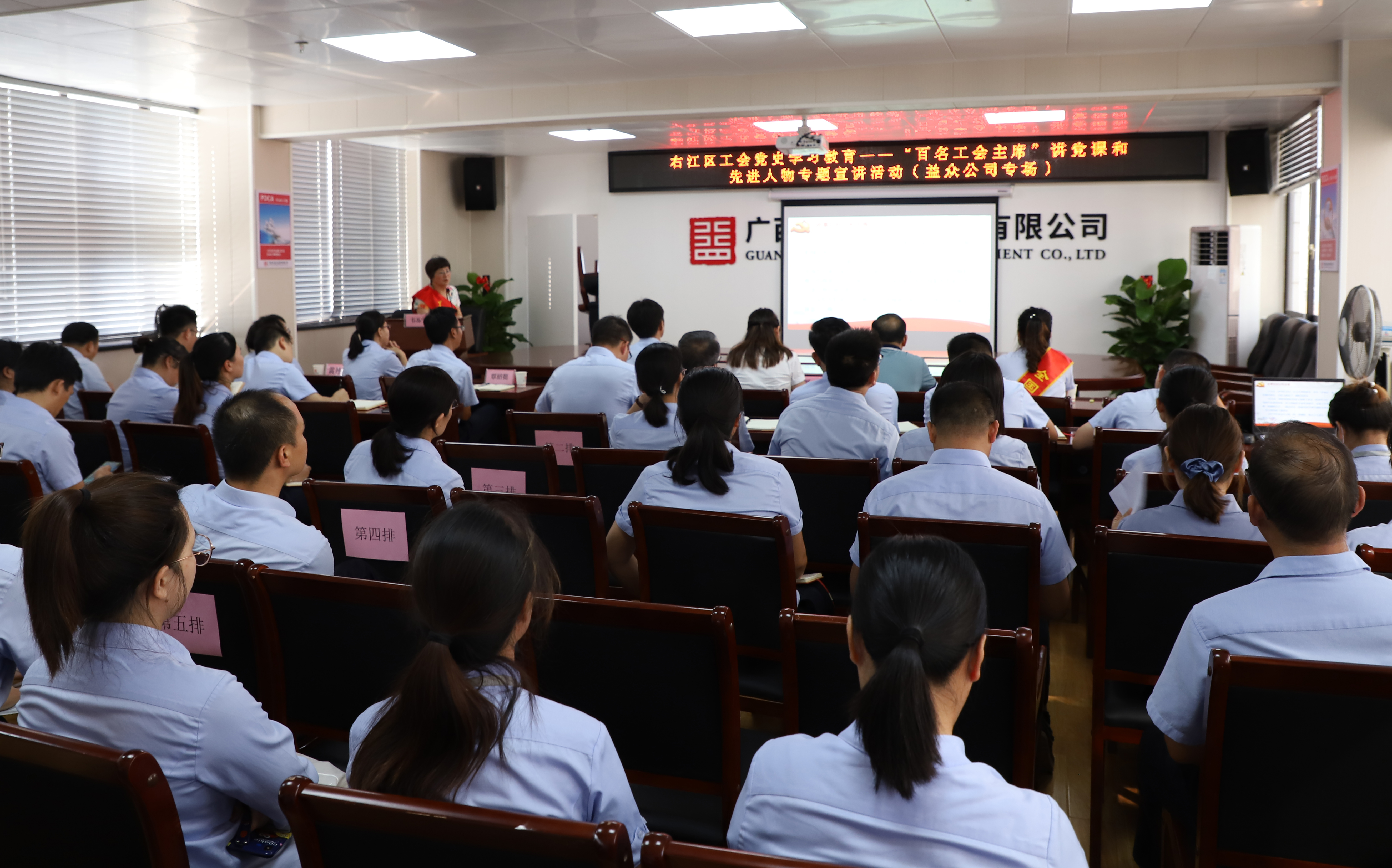 ????????6月18日,百色市工會黨史學(xué)習(xí)教育——“百名工會主席”講黨課和先進人物專題宣講活動(益眾公司專場)在益眾公司城北路辦公區(qū)11樓會議室舉行。百色市總工會黨組成員、經(jīng)審會主任黃光日,全國先進工作者、全國五一勞動獎?wù)?、國家稅?wù)總局百色市右江區(qū)稅務(wù)局稅源管理股副股長林恒和自治區(qū)先進工作者、廣西特級教師、自治區(qū)德育先進工作者百色市逸夫小學(xué)校長韋蘇寧分別作黨史黨課、黨史學(xué)習(xí)教育宣講報告,右江區(qū)總工會黨組書記、常務(wù)副主席覃璘清主持會議。益眾公司領(lǐng)導(dǎo)、全體黨員、入黨積極分子、職工代表等約80人參加宣講活動。