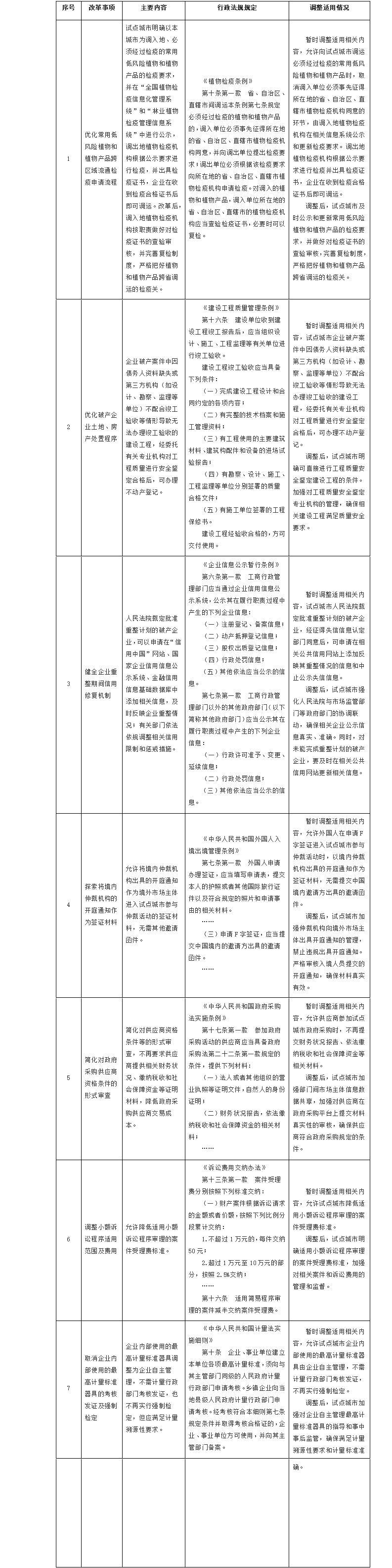 (十五)強(qiáng)化法治保障。按照重大改革于法有據(jù)的要求,依照法定程序開展?fàn)I商環(huán)境創(chuàng)新試點(diǎn)工作。國務(wù)院決定,根據(jù)《全國人民代表大會(huì)常務(wù)委員會(huì)關(guān)于授權(quán)國務(wù)院在營商環(huán)境創(chuàng)新試點(diǎn)城市暫時(shí)調(diào)整適用〈中華人民共和國計(jì)量法〉有關(guān)規(guī)定的決定》,3年內(nèi)在營商環(huán)境創(chuàng)新試點(diǎn)城市暫時(shí)調(diào)整適用《中華人民共和國計(jì)量法》有關(guān)規(guī)定;同時(shí),在營商環(huán)境創(chuàng)新試點(diǎn)城市暫時(shí)調(diào)整適用《植物檢疫條例》等7部行政法規(guī)有關(guān)規(guī)定。國務(wù)院有關(guān)部門和有關(guān)地方人民政府要根據(jù)法律、行政法規(guī)的調(diào)整情況,及時(shí)對本部門和本地區(qū)制定的規(guī)章、規(guī)范性文件作相應(yīng)調(diào)整,建立與試點(diǎn)要求相適應(yīng)的管理制度。對試點(diǎn)成效明顯的改革舉措,要及時(shí)推動(dòng)有關(guān)法律、法規(guī)、規(guī)章的立改廢釋,固化改革成果。