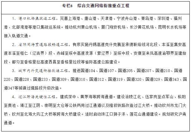 建設(shè)多節(jié)點(diǎn)、網(wǎng)格狀、全覆蓋的京津冀一體化綜合交通網(wǎng)絡(luò),基本建成軌道上的京津冀,高標(biāo)準(zhǔn)、高質(zhì)量打造雄安新區(qū)對(duì)外交通網(wǎng)絡(luò),加強(qiáng)北京城市副中心與中心城區(qū)、廊坊北三縣交通基礎(chǔ)設(shè)施互聯(lián)互通,強(qiáng)化北京冬奧會(huì)、冬殘奧會(huì)交通保障。依托長(zhǎng)江黃金水道,整體設(shè)計(jì)推進(jìn)長(zhǎng)江經(jīng)濟(jì)帶綜合交通運(yùn)輸體系建設(shè),補(bǔ)強(qiáng)沿江高鐵和鐵路貨運(yùn)能力,全力打通公路省際待貫通路段,提升江海聯(lián)運(yùn)、鐵水聯(lián)運(yùn)發(fā)展水平。推進(jìn)粵港澳大灣區(qū)基礎(chǔ)設(shè)施互聯(lián)互通,優(yōu)化航運(yùn)和航空資源配置,加強(qiáng)港澳與內(nèi)地的交通聯(lián)系,支持香港提升國(guó)際航運(yùn)、國(guó)際航空樞紐地位。推動(dòng)長(zhǎng)三角地區(qū)交通運(yùn)輸更高質(zhì)量一體化發(fā)展,加快對(duì)外交通、城際交通、都市圈交通高效銜接和有機(jī)融合,協(xié)同推進(jìn)港航、海事一體化發(fā)展,推動(dòng)上海市、江蘇省、浙江省、安徽省共建輻射全球的航運(yùn)樞紐,加快提升江蘇通州灣江海聯(lián)動(dòng)示范區(qū)功能,打造長(zhǎng)江集裝箱運(yùn)輸新出??凇?gòu)建海南島內(nèi)暢通、陸島連通、全球通達(dá)的現(xiàn)代綜合交通運(yùn)輸體系,建設(shè)現(xiàn)代化綜合交通樞紐,穩(wěn)步推進(jìn)自由貿(mào)易港建設(shè)。構(gòu)建黃河流域綠色安全便捷綜合交通網(wǎng)絡(luò),強(qiáng)化跨區(qū)域大通道建設(shè)。