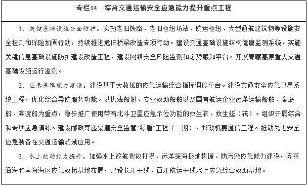 健全綜合交通運(yùn)輸應(yīng)急管理體制機(jī)制,完善應(yīng)急協(xié)調(diào)機(jī)制和應(yīng)急預(yù)案體系,加強(qiáng)交通運(yùn)輸調(diào)度與應(yīng)急指揮平臺(tái)建設(shè)。推進(jìn)區(qū)域性公路應(yīng)急裝備物資儲(chǔ)備中心建設(shè)。加強(qiáng)水上交通安全監(jiān)管、航海保障和救助打撈能力建設(shè),完善沿海和內(nèi)河溢油應(yīng)急設(shè)備庫(kù),構(gòu)建陸??仗煲惑w化水上交通運(yùn)輸安全保障體系。建設(shè)城市軌道交通應(yīng)急演練中心。以骨干航空物流企業(yè)為主體構(gòu)建航空應(yīng)急服務(wù)網(wǎng)絡(luò)。建設(shè)海事監(jiān)管指揮系統(tǒng)。在開(kāi)展城市交通基礎(chǔ)設(shè)施地下空間、低洼區(qū)域、重點(diǎn)區(qū)段、重要點(diǎn)位、關(guān)鍵設(shè)施等隱患排查基礎(chǔ)上,建立健全風(fēng)險(xiǎn)臺(tái)賬和災(zāi)害隱患清單,補(bǔ)齊設(shè)施設(shè)備、應(yīng)急搶險(xiǎn)物資等短板,持續(xù)完善應(yīng)急處置預(yù)案,健全應(yīng)急響應(yīng)機(jī)制,提升應(yīng)對(duì)極端天氣能力。加強(qiáng)應(yīng)急專業(yè)隊(duì)伍和志愿者隊(duì)伍建設(shè),充實(shí)國(guó)家應(yīng)急運(yùn)輸儲(chǔ)備力量。健全應(yīng)對(duì)重大疫情、防范應(yīng)對(duì)恐怖襲擊、保障信息安全等非傳統(tǒng)安全應(yīng)急指揮體系和應(yīng)急交通組織。