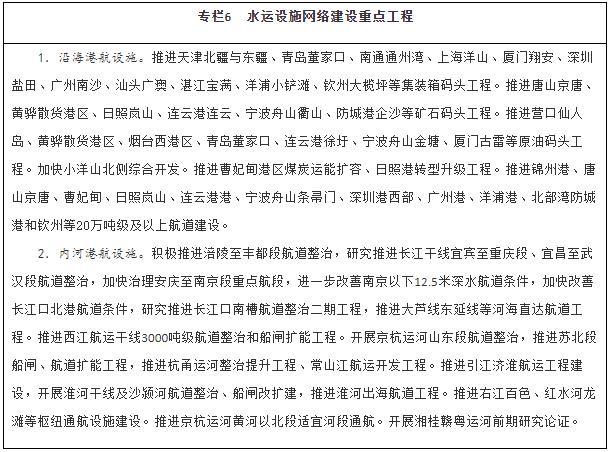 優(yōu)化暢通水運(yùn)設(shè)施網(wǎng)絡(luò)。建設(shè)京津冀、長(zhǎng)三角、粵港澳大灣區(qū)世界級(jí)港口群,支持山東打造世界一流的海洋港口,推進(jìn)東北地區(qū)沿海港口一體化發(fā)展,優(yōu)化港口功能布局,推動(dòng)資源整合和共享共用。有序推進(jìn)沿海港口專業(yè)化碼頭及進(jìn)出港航道等公共設(shè)施建設(shè)。適度超前建設(shè)糧食、能源、礦產(chǎn)資源的接卸、儲(chǔ)存、中轉(zhuǎn)設(shè)施,推進(jìn)沿海沿江液化天然氣碼頭規(guī)劃建設(shè)。提升內(nèi)河港口專業(yè)化、規(guī)?;?,合理集中布局集裝箱、煤炭、鐵礦石、商品汽車等專業(yè)化碼頭。加強(qiáng)內(nèi)河高等級(jí)航道擴(kuò)能升級(jí)與暢通攻堅(jiān)建設(shè),完善長(zhǎng)江、珠江、京杭運(yùn)河和淮河等水系內(nèi)河高等級(jí)航道網(wǎng)絡(luò),進(jìn)一步提升珠三角高等級(jí)航道網(wǎng)出海能力,全面加強(qiáng)長(zhǎng)三角、珠江—西江高等級(jí)航道網(wǎng)未達(dá)標(biāo)段建設(shè)。推動(dòng)重要支流航道和庫(kù)湖區(qū)航道、內(nèi)河旅游航道、便民碼頭建設(shè)。