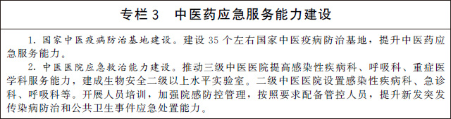 加強中醫(yī)藥應急救治能力建設。依托高水平三級甲等中醫(yī)醫(yī)院,建設覆蓋所有省份的國家中醫(yī)疫病防治基地,依托基地組建中醫(yī)疫病防治隊伍,提升中醫(yī)緊急醫(yī)學救援能力。三級公立中醫(yī)醫(yī)院和中西醫(yī)結合醫(yī)院(不含中醫(yī)??漆t(yī)院)全部設置發(fā)熱門診,加強感染性疾病、急診、重癥、呼吸、檢驗等相關科室建設,提升服務能力。