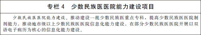 3.發(fā)展少數(shù)民族醫(yī)藥。加強少數(shù)民族醫(yī)醫(yī)療機構建設,提高民族地區(qū)基層醫(yī)療衛(wèi)生機構少數(shù)民族醫(yī)藥服務能力。改善少數(shù)民族醫(yī)醫(yī)院基礎設施條件,加強少數(shù)民族醫(yī)醫(yī)院??颇芰?、制劑能力和信息化能力建設。建立符合少數(shù)民族醫(yī)醫(yī)療機構自身特點和發(fā)展規(guī)律的績效評價指標體系。加大少數(shù)民族醫(yī)藥防治重大疾病和優(yōu)勢病種研究力度,有效傳承特色診療技術和方法。鼓勵和扶持少數(shù)民族醫(yī)藥院校教育、師承教育和繼續(xù)教育。加大對少數(shù)民族醫(yī)藥的傳承保護力度,持續(xù)開展少數(shù)民族醫(yī)藥文獻搶救整理工作,推動理論創(chuàng)新和技術創(chuàng)新。